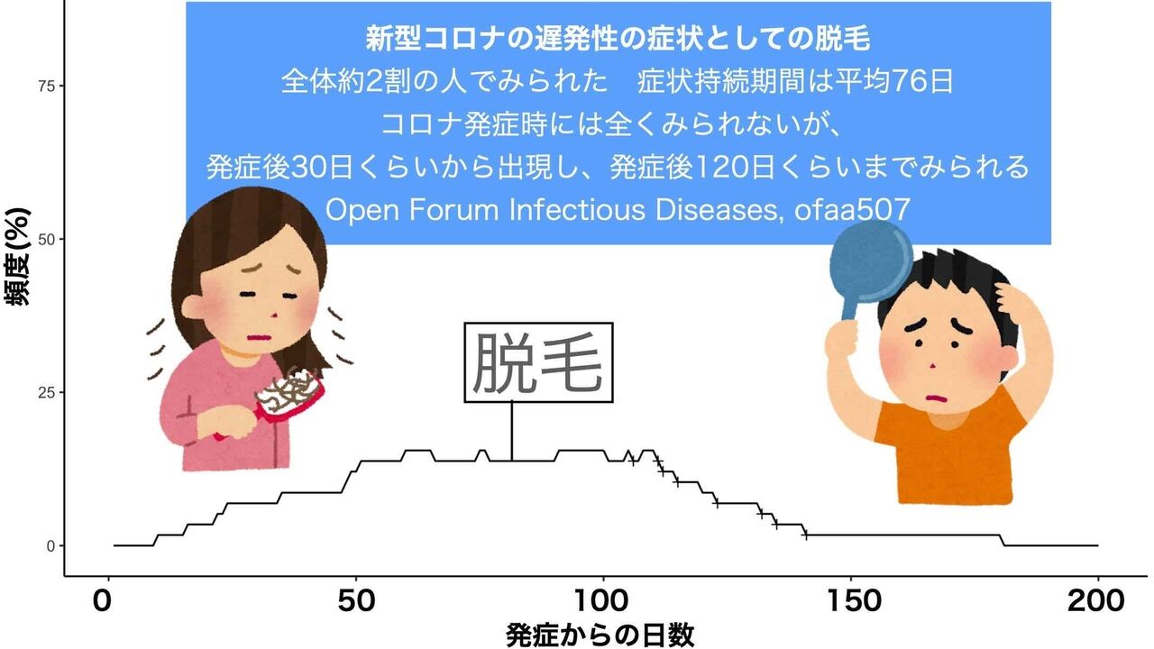 その症状は倦怠感、頭痛、発熱、呼吸困難、咳、脱毛、味覚・嗅覚障害、筋肉痛など多岐にわたる。