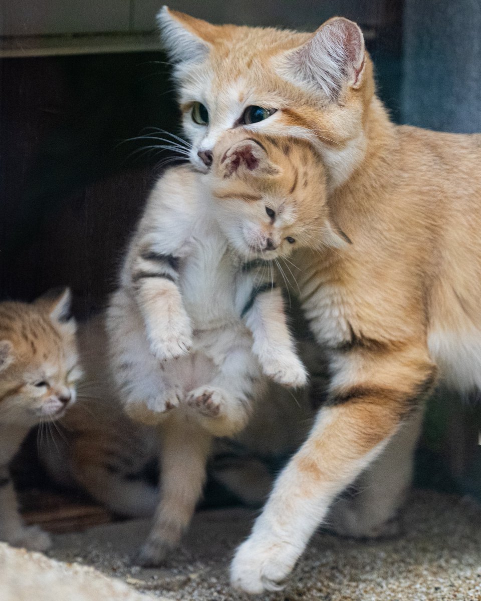お母さんに強制連行されるスナネコの赤ちゃんたち 「いやだー」って声が聞こえてきそうな表情があいらしい