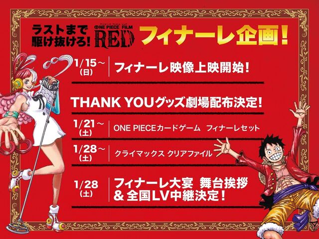 >また、終映まで残り僅かとなった本作を映画館で鑑賞した人へTHANK YOUグッズの配布も決定。21日から配布開始となるのは、「ワンピースカードゲームフィナーレセット」。第2弾入場者プレゼントで大好評だった「ワンピースカードゲーム」が新しいバージョンになって登場する。