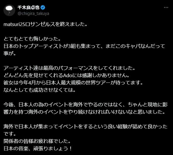 歌い手・Ado(22)、女優・平手友梨奈(23)らが所属する芸能事務所「クラウドナイン」の代表取締役社長・千木良卓也氏が19日までに自身のX(旧ツイッター)を更新。16日(現地時間17日)米ロサンゼルスで行われた音楽イベント「matsuri ‘25: Japanese Music Experience LOS ANGELES」についての“本音”を吐露した。